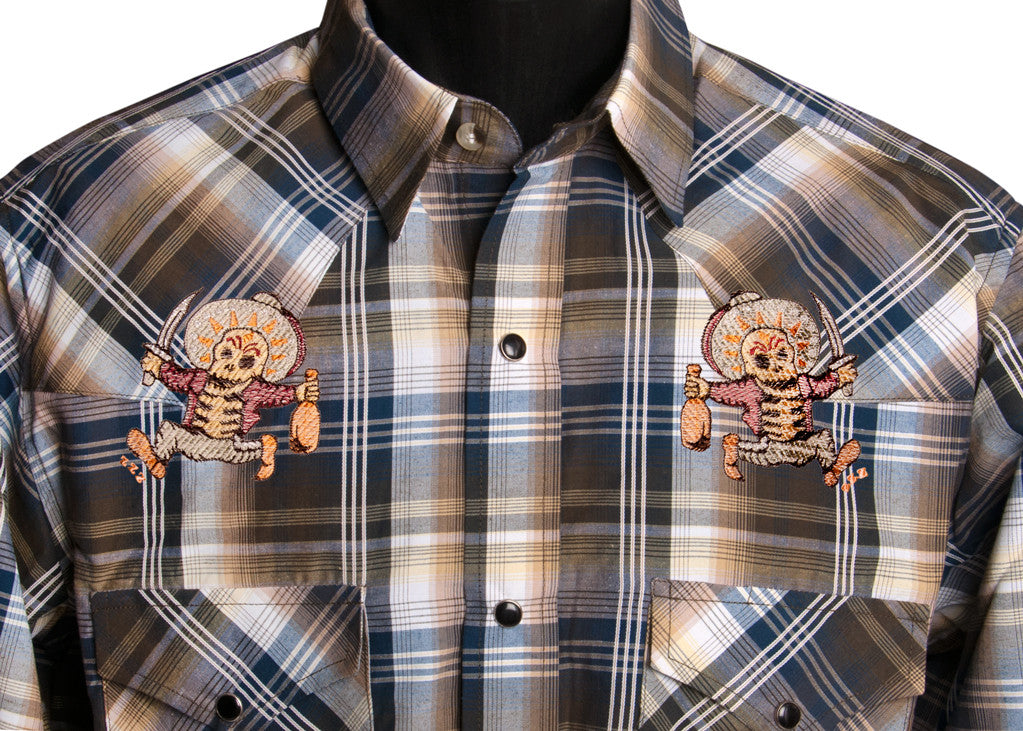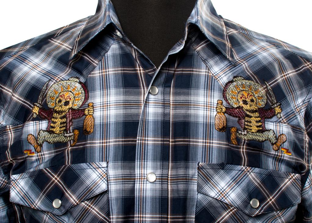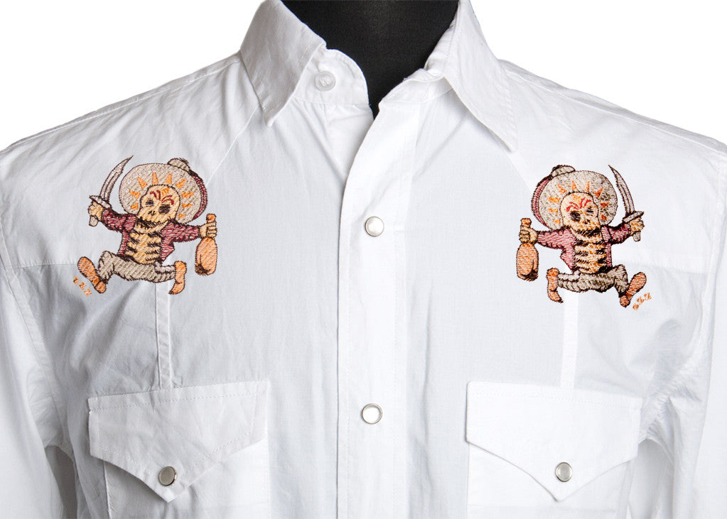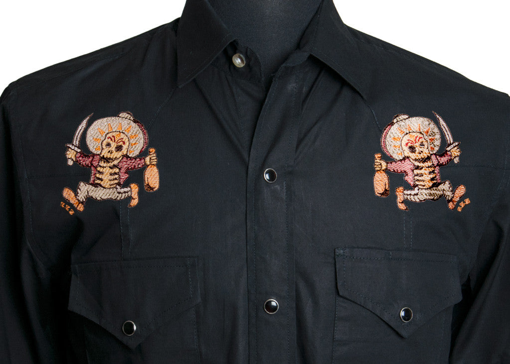 Drink more mezcal and run with swords! The borrachos on this short sleeved embroidered pearl snap is doing everything you wish you could....never mind what happened during Spring Break in Mexico.