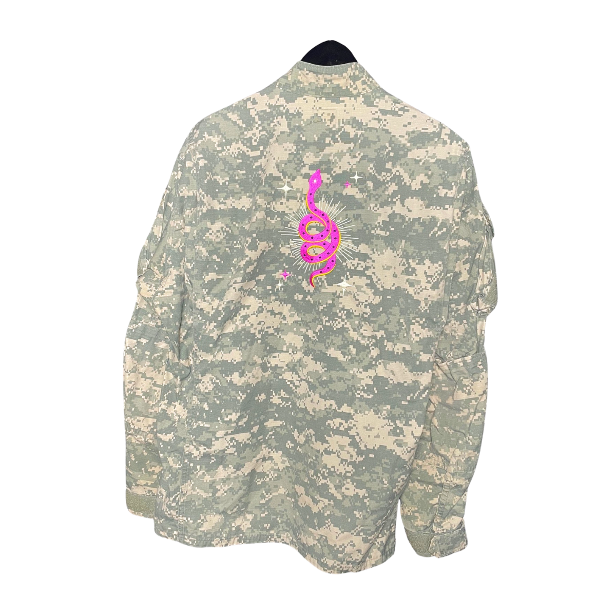 Turn heads and own the room with our decommissioned vintage military jackets, now featuring a bold pink snake embroidery on the back. These one-of-a-kind jackets blend rugged history with striking modern design, making them the ultimate statement piece. Perfect for anyone who likes their style edgy, unique, and impossible to ignore. Wear it loud, wear it proud—this isn’t your average outerwear.